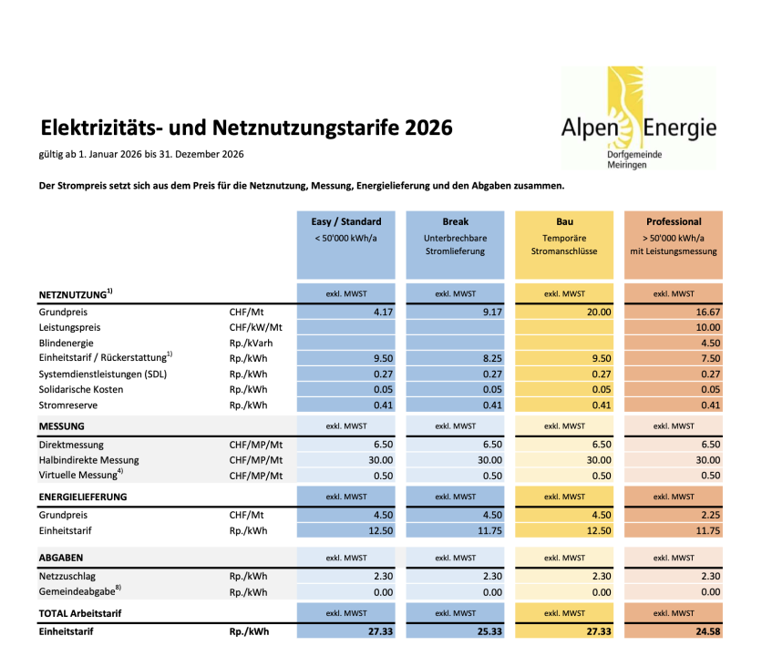 Die neuen Tarife sind da. Unter «Strom» finden Sie alle neuen Tarife, gültig ab 1. Januar 2026. Die Kundeninformation finden Sie im Anhang.